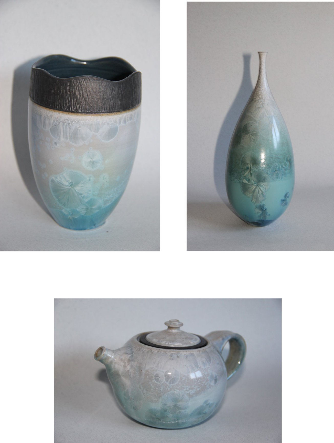 Créations céramiques en grès et porcelaine, émail à cristallisations pièces décoratives et utilitaires. Gobelets, théière, vases, lampes…
